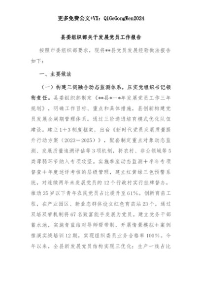【七哥公文】2025年:【七哥公文】县委组织部关于发展党员工作报告+更多免费公文+VX:QiGeGongWen2024+更多免费公文+VX:QiGeGongWen2024