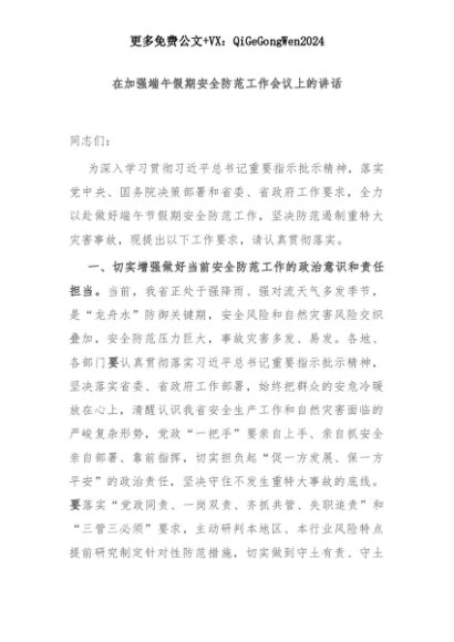 【七哥公文】2025年:【七哥公文】在加强端午假期安全防范工作会议上的讲话+更多免费公文+VX:QiGeGongWen2024+更多免费公文+VX:QiGeGongWen2024