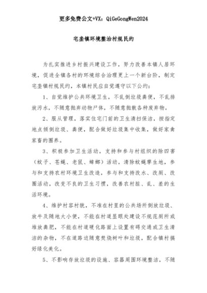 【七哥公文】2025年:【七哥公文】宅垄镇环境整治村规民约+更多免费公文+VX:QiGeGongWen2024+更多免费公文+VX:QiGeGongWen2024