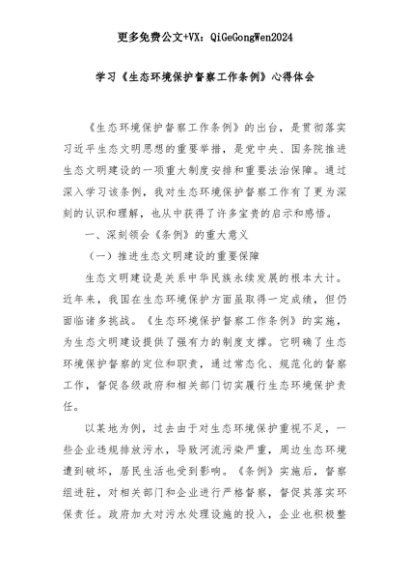 【七哥公文】2025年:【七哥公文】学习《生态环境保护督察工作条例》心得体会+更多免费公文+VX:QiGeGongWen2024+更多免费公文+VX:QiGeGongWen2024