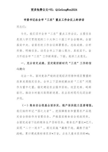 【七哥公文】2025年:【七哥公文】市委书记在全市“三农”重点工作会议上的讲话+更多免费公文+VX:QiGeGongWen2024+更多免费公文+VX:QiGeGongWen2024
