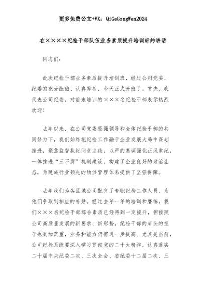 【七哥公文】2025年:【七哥公文】在公司纪检干部队伍业务素质提升培训班的讲话+更多免费公文+VX:QiGeGongWen2024+更多免费公文+VX:QiGeGongWen2024