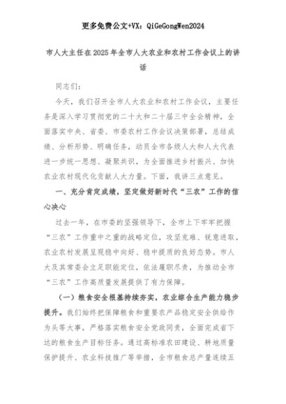 【七哥公文】2025年:【七哥公文】市人大主任在2025年全市人大农业和农村工作会议上的讲话+更多免费公文+VX:QiGeGongWen2024+更多免费公文+VX:QiGeGongWen2024