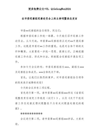 【七哥公文】2025年:【七哥公文】在市委巡察组巡察动员会上的主持词暨表态发言+更多免费公文+VX:QiGeGongWen2024+更多免费公文+VX:QiGeGongWen2024