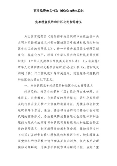 【七哥公文】2025年:【七哥公文】完善村规民约和社区公约指导意见+更多免费公文+VX:QiGeGongWen2024+更多免费公文+VX:QiGeGongWen2024