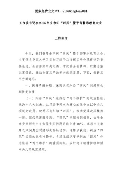 【七哥公文】2025年:【七哥公文】X市委书记在2025年全市纠“四风”暨干部警示教育大会上的讲话+更多免费公文+VX:QiGeGongWen2024+更多免费公文+VX:QiGeGongWen2024