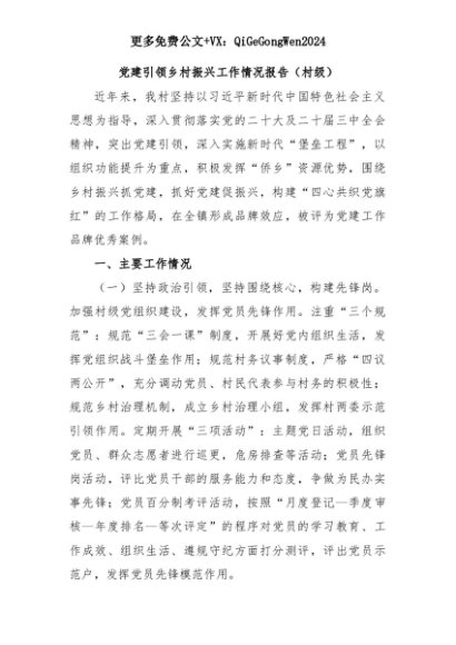 【七哥公文】2025年:【七哥公文】党建引领乡村振兴工作情况报告(村级)+更多免费公文+VX:QiGeGongWen2024+更多免费公文+VX:QiGeGongWen2024