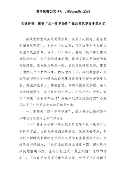 【七哥公文】2025年:【七哥公文】党课讲稿:聚焦“三个贯穿始终”推动作风建设走深走实+更多免费公文+VX:QiGeGongWen2024+更多免费公文+VX:QiGeGongWen2024