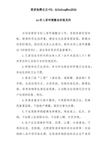 【七哥公文】2025年:【七哥公文】xx村人居环境整治村规民约+更多免费公文+VX:QiGeGongWen2024+更多免费公文+VX:QiGeGongWen2024
