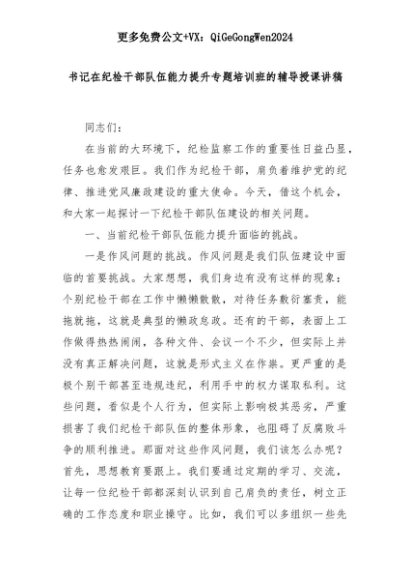【七哥公文】2025年:【七哥公文】书记在纪检干部队伍能力提升专题培训班的辅导授课讲稿+更多免费公文+VX:QiGeGongWen2024+更多免费公文+VX:QiGeGongWen2024