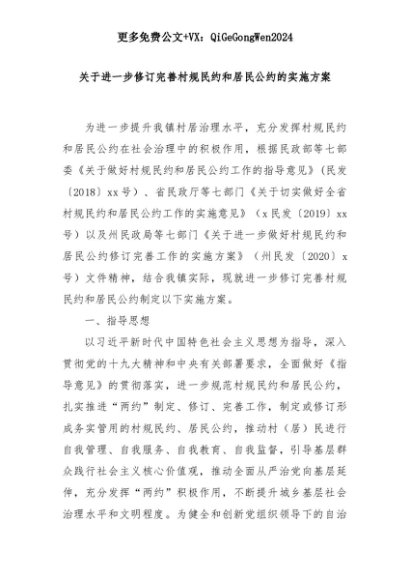 【七哥公文】2025年:【七哥公文】关于进一步修订完善村规民约和居民公约的实施方案+更多免费公文+VX:QiGeGongWen2024+更多免费公文+VX:QiGeGongWen2024