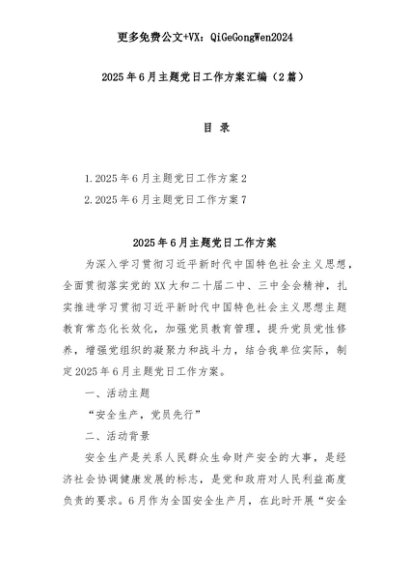 【七哥公文】2025年:【七哥公文】(2篇)2025年6月主题党日工作方案汇编+更多免费公文+VX:QiGeGongWen2024+更多免费公文+VX:QiGeGongWen2024