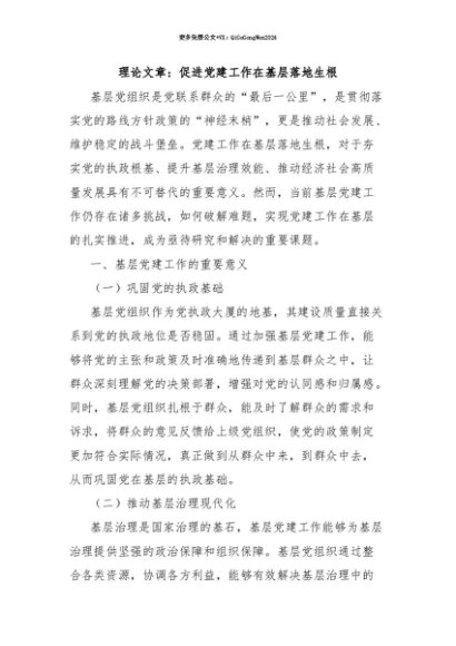 【七哥公文】2025年:【七哥公文】理论文章:促进党建工作在基层落地生根+更多免费公文+VX:QiGeGongWen2024+更多免费公文+VX:QiGeGongWen2024