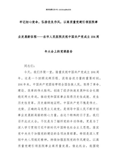 【七哥公文】2025年:【七哥公文】牢记初心使命,弘扬优良作风,以高质量党建引领医院事业发展新征程——在市人民医院庆祝中国共产党成立104周年大会上的党课报告+更多免费公文+VX:QiGeGongWen2024+更多免费公文+VX:QiGeGongWen2024
