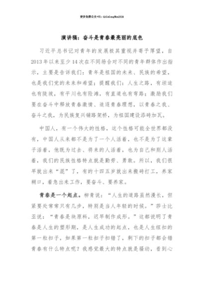 【七哥公文】2025年:【七哥公文】演讲稿:奋斗是青春最亮丽的底色+更多免费公文+VX:QiGeGongWen2024+更多免费公文+VX:QiGeGongWen2024