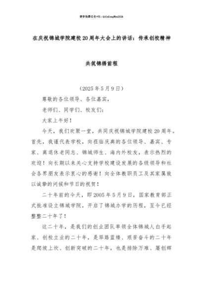 【七哥公文】2025年:【七哥公文】在庆祝锦城学院建校20周年大会上的讲话:传承创校精神共筑锦绣前程+更多免费公文+VX:QiGeGongWen2024+更多免费公文+VX:QiGeGongWen2024