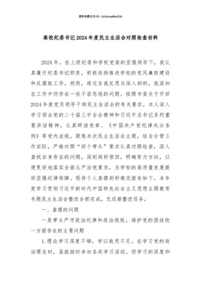 【七哥公文】2025年:【七哥公文】高校纪委书记2024年度民主生活会对照检查材料(四个带头+坚决抵制违规吃喝情况方面+意识形态+反面典型案例剖析)+更多免费公文+VX:QiGeGongWen2024+更多免费公文+VX:QiGeGongWen2024