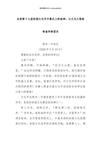 【七哥公文】2025年:【七哥公文】在校第十七届校园文化节开幕式上的致辞:以文化之笔绘青春华章肥东+更多免费公文+VX:QiGeGongWen2024+更多免费公文+VX:QiGeGongWen2024