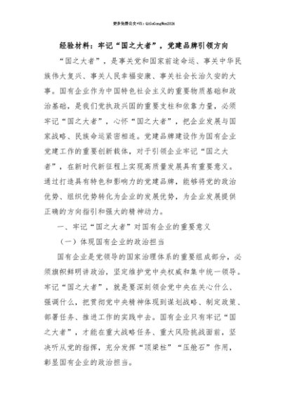 【七哥公文】2025年:【七哥公文】经验材料:牢记“国之大者”,党建品牌引领方向+更多免费公文+VX:QiGeGongWen2024+更多免费公文+VX:QiGeGongWen2024