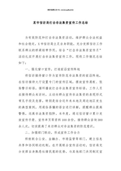 【七哥公文】2025年:【七哥公文】某市信访局打击非法集资宣传工作总结+更多免费公文+VX:QiGeGongWen2024+更多免费公文+VX:QiGeGongWen2024