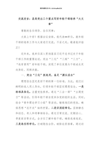 【七哥公文】2025年:【七哥公文】交流发言:县局突出三个重点写好年轻干部培养“大文章”+更多免费公文+VX:QiGeGongWen2024+更多免费公文+VX:QiGeGongWen2024