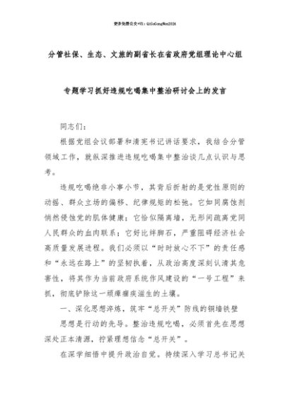【七哥公文】2025年:【七哥公文】分管社保、生态、文旅的副省长在省政府党组理论中心组专题学习抓好违规吃喝集中整治研讨会上的发言+更多免费公文+VX:QiGeGongWen2024+更多免费公文+VX:QiGeGongWen2024