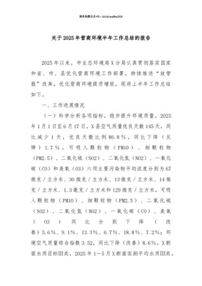 【七哥公文】2025年:【七哥公文】关于2025年营商环境半年工作总结的报告+更多免费公文+VX:QiGeGongWen2024+更多免费公文+VX:QiGeGongWen2024
