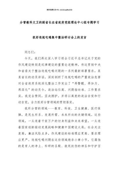 【七哥公文】2025年:【七哥公文】分管教科文卫的副省长在省政府党组理论中心组专题学习抓好违规吃喝集中整治研讨会上的发言+更多免费公文+VX:QiGeGongWen2024+更多免费公文+VX:QiGeGongWen2024