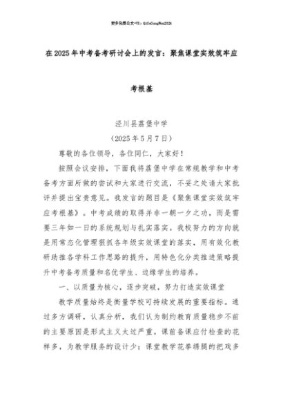 【七哥公文】2025年:【七哥公文】在2025年中考备考研讨会上的发言:聚焦课堂实效筑牢应考根基+更多免费公文+VX:QiGeGongWen2024+更多免费公文+VX:QiGeGongWen2024
