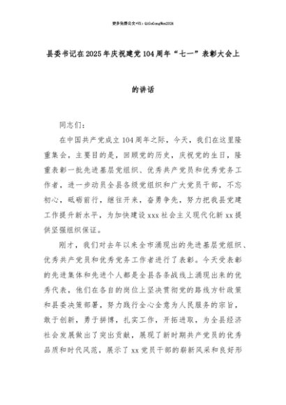 【七哥公文】2025年:【七哥公文】县委书记在2025年庆祝建党104周年“七一”表彰大会上的讲话+更多免费公文+VX:QiGeGongWen2024+更多免费公文+VX:QiGeGongWen2024