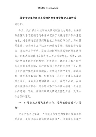 【七哥公文】2025年:【七哥公文】县委书记在市级巡察反馈问题整改专题会上的讲话+更多免费公文+VX:QiGeGongWen2024+更多免费公文+VX:QiGeGongWen2024