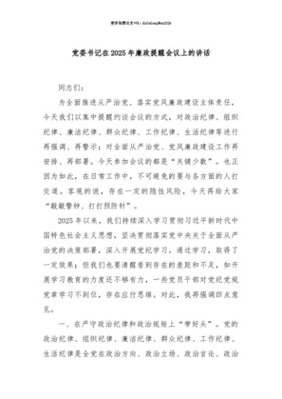 【七哥公文】2025年:【七哥公文】党委书记在2025年廉政提醒会议上的讲话+更多免费公文+VX:QiGeGongWen2024+更多免费公文+VX:QiGeGongWen2024