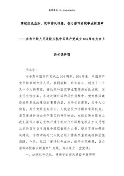 【七哥公文】2025年:【七哥公文】赓续红色血脉,筑牢作风根基,奋力谱写法院事业新篇章——在市中级人民法院庆祝中国共产党成立104周年大会上的党课讲稿+更多免费公文+VX:QiGeGongWen2024+更多免费公文+VX:QiGeGongWen2024