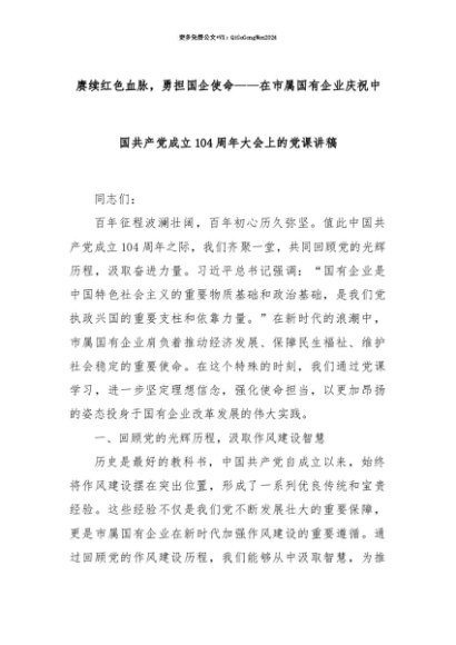 【七哥公文】2025年:【七哥公文】赓续红色血脉,勇担国企使命——在市属国有企业庆祝中国共产党成立104周年大会上的党课讲稿+更多免费公文+VX:QiGeGongWen2024+更多免费公文+VX:QiGeGongWen2024