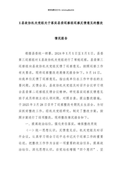 【七哥公文】2025年:【七哥公文】X县政协机关党组关于落实县委巡察组巡察反馈意见的整改情况报告+更多免费公文+VX:QiGeGongWen2024+更多免费公文+VX:QiGeGongWen2024