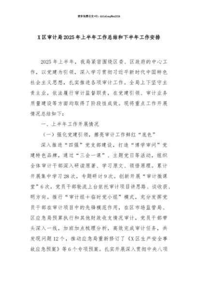 【七哥公文】2025年:【七哥公文】X区审计局2025年上半年工作总结和下半年工作安排+更多免费公文+VX:QiGeGongWen2024+更多免费公文+VX:QiGeGongWen2024