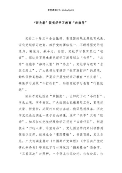 【七哥公文】2025年:【七哥公文】“回头看”促党纪学习教育“向前行”+更多免费公文+VX:QiGeGongWen2024+更多免费公文+VX:QiGeGongWen2024