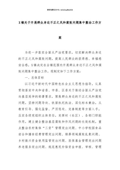 【七哥公文】2025年:【七哥公文】X镇关于开展群众身边不正之风和腐败问题集中整治工作方案+更多免费公文+VX:QiGeGongWen2024+更多免费公文+VX:QiGeGongWen2024