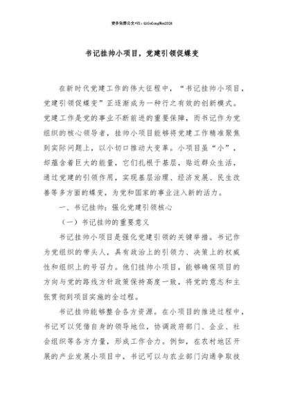 【七哥公文】2025年:【七哥公文】书记挂帅小项目,党建引领促蝶变+更多免费公文+VX:QiGeGongWen2024+更多免费公文+VX:QiGeGongWen2024