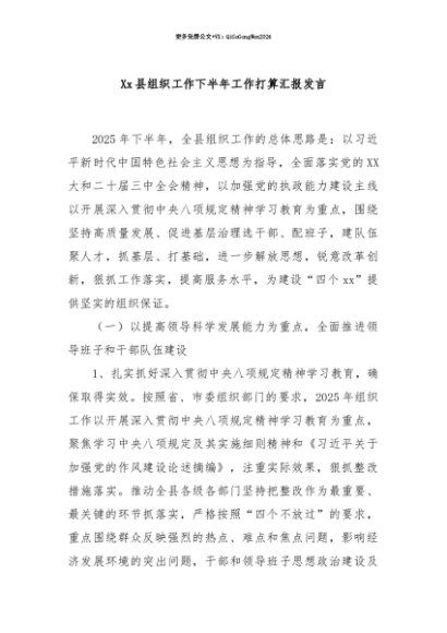 【七哥公文】2025年:【七哥公文】Xx县组织工作下半年工作打算汇报发言+更多免费公文+VX:QiGeGongWen2024+更多免费公文+VX:QiGeGongWen2024