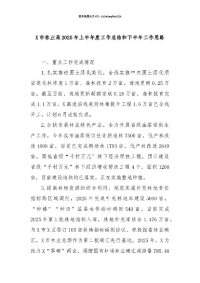 【七哥公文】2025年:【七哥公文】X市林业局2025年上半年度工作总结和下半年工作思路+更多免费公文+VX:QiGeGongWen2024+更多免费公文+VX:QiGeGongWen2024