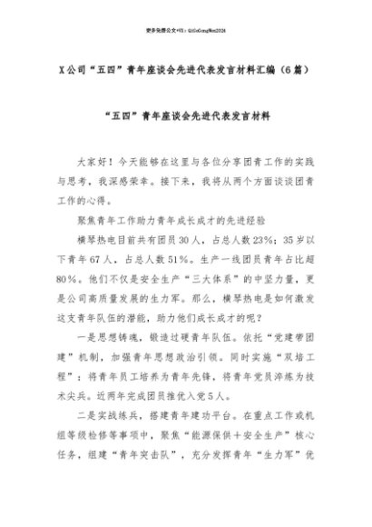 【七哥公文】2025年:【七哥公文】(6篇)X公司“五四”青年座谈会先进代表发言材料汇编+更多免费公文+VX:QiGeGongWen2024+更多免费公文+VX:QiGeGongWen2024