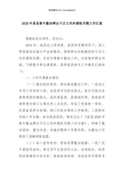 【七哥公文】2025年:【七哥公文】2025年某县集中整治群众不正之风和腐败问题工作汇报+更多免费公文+VX:QiGeGongWen2024+更多免费公文+VX:QiGeGongWen2024