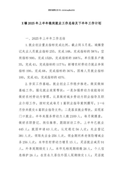 【七哥公文】2025年:【七哥公文】X镇2025年上半年稳岗就业工作总结及下半年工作计划+更多免费公文+VX:QiGeGongWen2024+更多免费公文+VX:QiGeGongWen2024