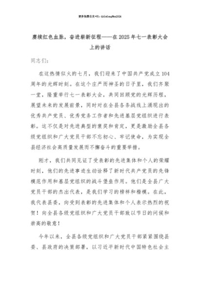 【七哥公文】2025年:【七哥公文】赓续红色血脉,奋进崭新征程——在2025年七一表彰大会上的讲话+更多免费公文+VX:QiGeGongWen2024+更多免费公文+VX:QiGeGongWen2024