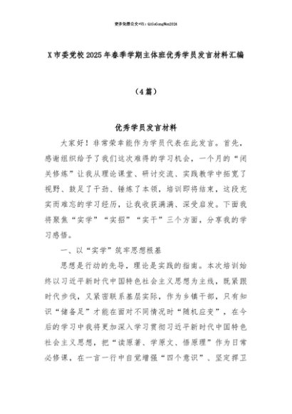 【七哥公文】2025年:【七哥公文】(4篇)X市委党校2025年春季学期主体班优秀学员发言材料汇编+更多免费公文+VX:QiGeGongWen2024+更多免费公文+VX:QiGeGongWen2024
