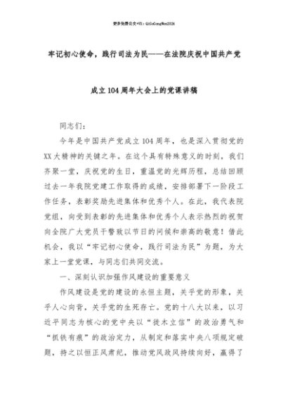 【七哥公文】2025年:【七哥公文】牢记初心使命,践行司法为民——在法院庆祝中国共产党成立104周年大会上的党课讲稿+更多免费公文+VX:QiGeGongWen2024+更多免费公文+VX:QiGeGongWen2024