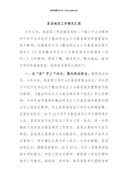 【七哥公文】2025年:【七哥公文】某县减负工作情况汇报+更多免费公文+VX:QiGeGongWen2024+更多免费公文+VX:QiGeGongWen2024