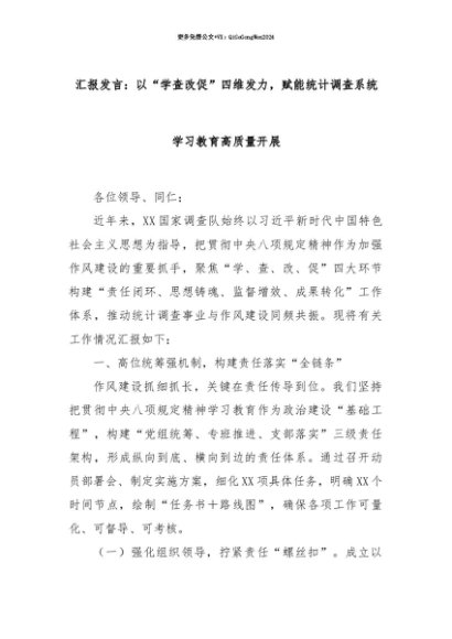 【七哥公文】2025年:【七哥公文】汇报发言:以“学查改促”四维发力,赋能统计调查系统学习教育高质量开展+更多免费公文+VX:QiGeGongWen2024+更多免费公文+VX:QiGeGongWen2024