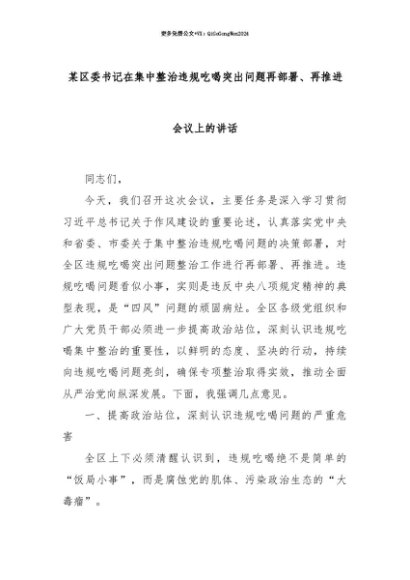 【七哥公文】2025年:【七哥公文】某区委书记在集中整治违规吃喝突出问题再部署、再推进会议上的讲话+更多免费公文+VX:QiGeGongWen2024+更多免费公文+VX:QiGeGongWen2024